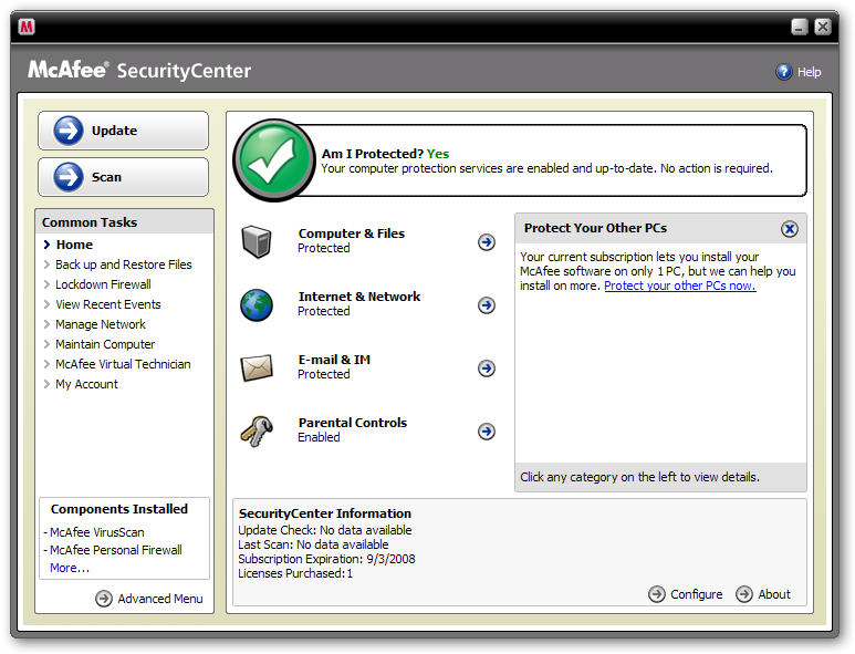 McAfee® Total Protection™ is hassle-free, all-you-need security ideal for people who are constantly online for communication, shopping, banking, trading or viewing entertainment. It features the award-winning McAfee SiteAdvisor® Plus web security tool that warns about and blocks risky web sites. McAfee® Total Protection™ protects your family and entire network of PCs from viruses, spyware, hackers, identity thieves, and online scammers. It also offers parental controls.